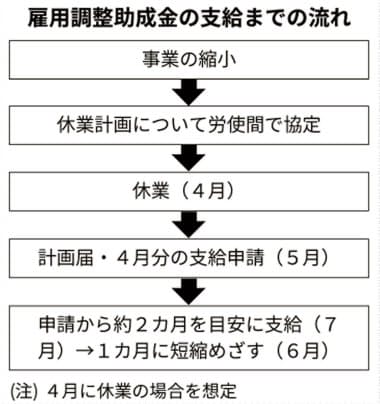 日本経済新聞は、雇用調整助成金について、「申請は10種類以上の書類を用意する必要があり、支給までも2カ月ほどかかることが多い。厚生労働省は企業が待つ期間を約1カ月まで短縮することを目指しており、手続きの簡素化や事務処理体制の強化を急ぐ。」と報じています(2020/4/8 23:31 (2020/4/9 4:43更新)日本経済新聞 電子版。下図も同紙より引用)